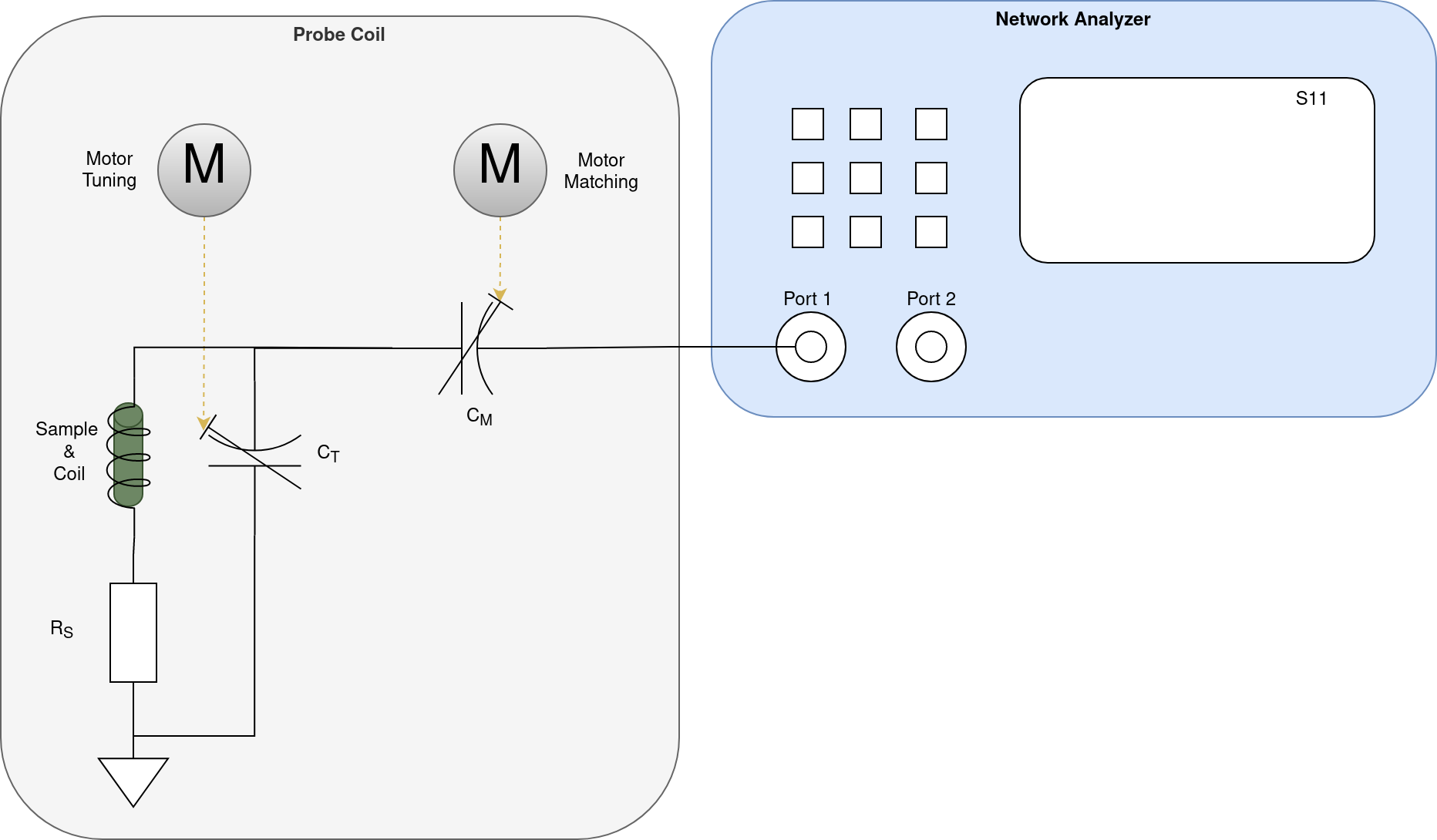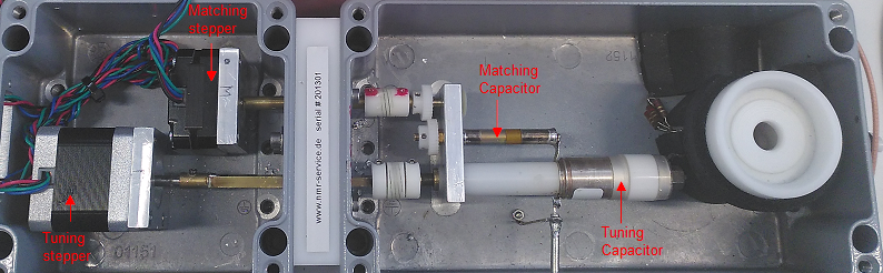 For Tuning and Matching the coil has two adjustable capacitors. One for tuning and one for matching of the probe coil: