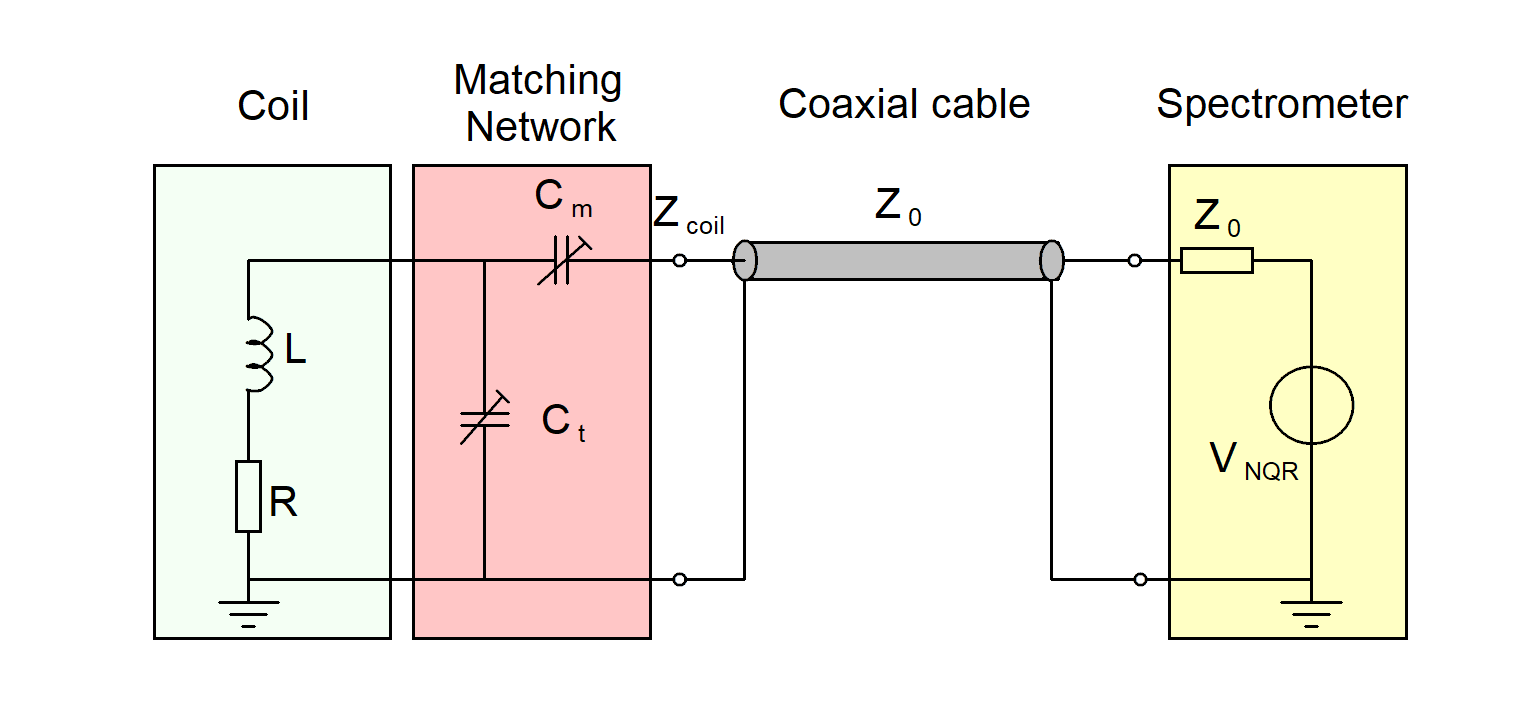 At high frequencies the impedance of the coil has to be matched to the characteristic impedance of the cables and spectrometer of \(50 \Omega\). If we don’t match the impedance, the signal will be reflected at the coil and we will lose signal strength.